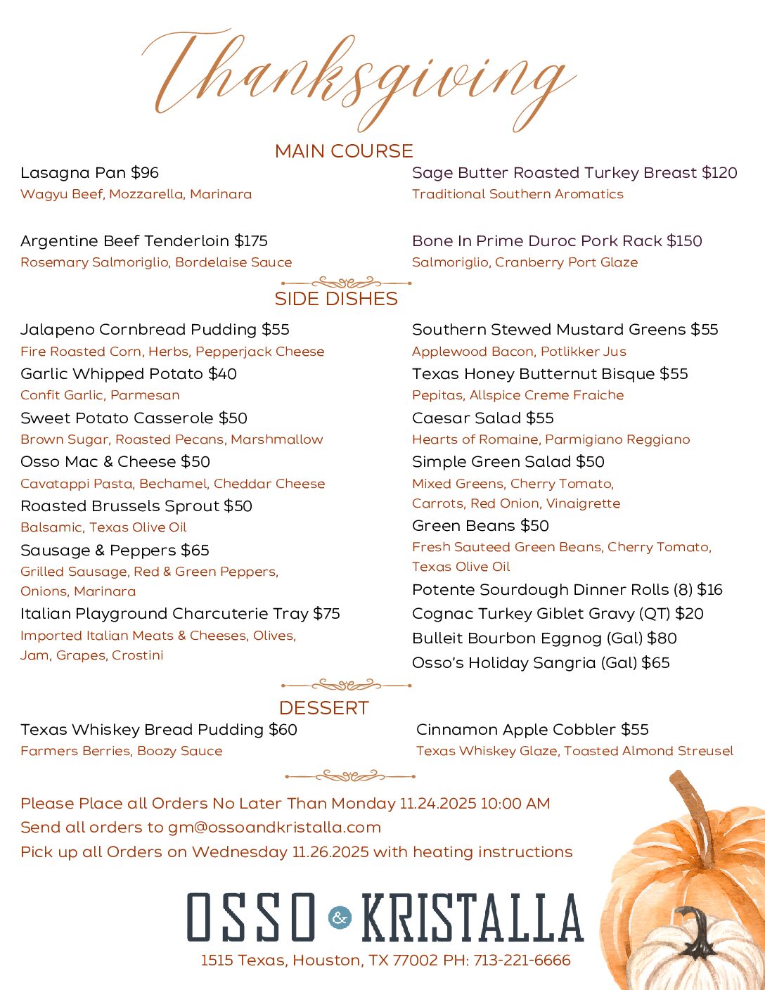 Osso & Kristalla 1515 Texas Avenue, Houston, TX, United StatesThanksgiving Pick-Up Dinner Bring home a cozy, chef-prepared Thanksgiving from Osso & Kristalla—classic holiday comfort with Italian-American flair. We’ll handle the cooking; you handle the toasts. How It Works - Order Deadline: Please place all orders no later than Monday, November 24, 2025 at 10:00 AM (CT). - How to Order: Email your selections to …
