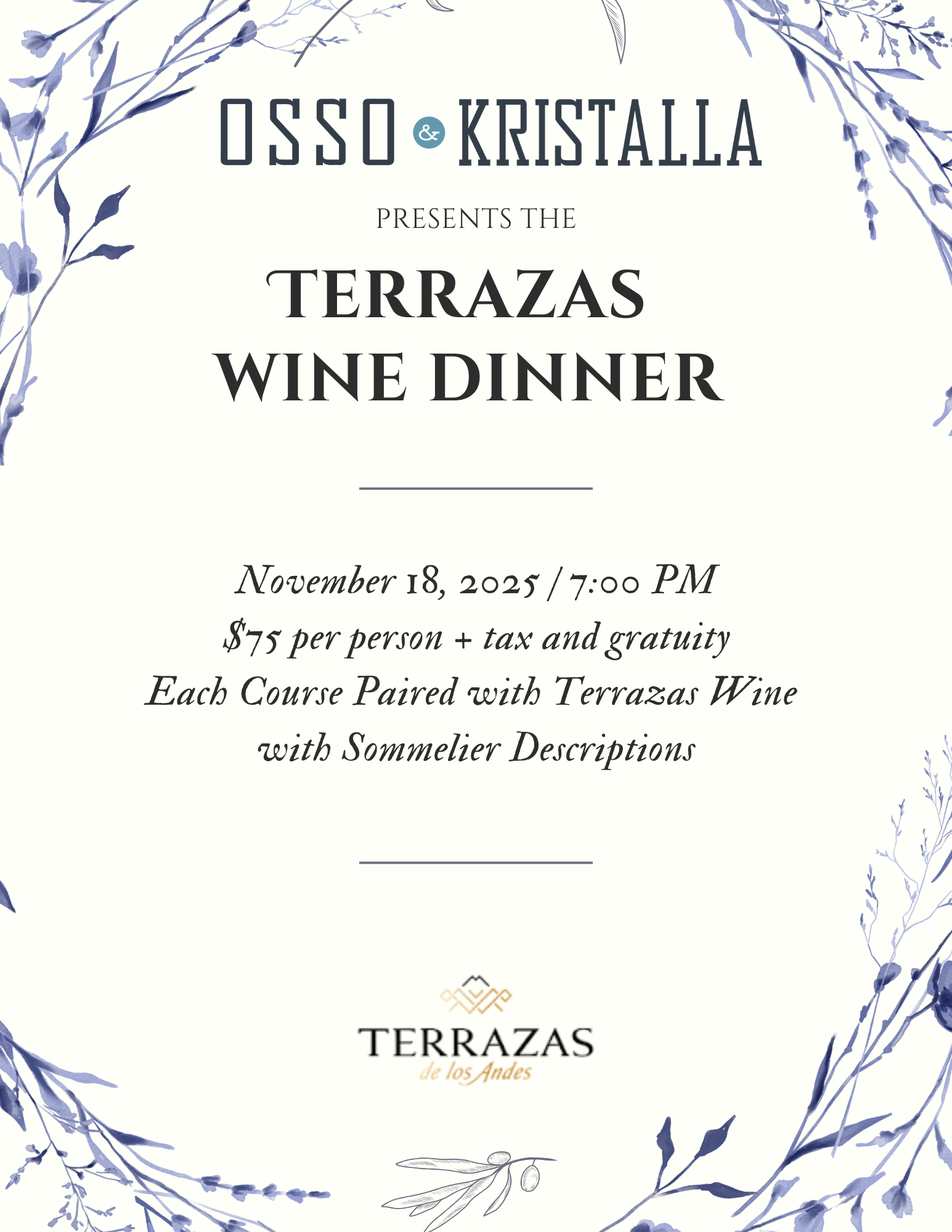Tuesday, November 18, 2025 • 7:00 PM$75 per person + tax & gratuity Join us for an intimate evening featuring a multi-course menu, with each course thoughtfully paired with Terrazas wines. Our sommelier will guide you through tasting notes and pairing insights, bringing the terroir to life with expert descriptions. The Experience Multi-course chef-crafted dinner …